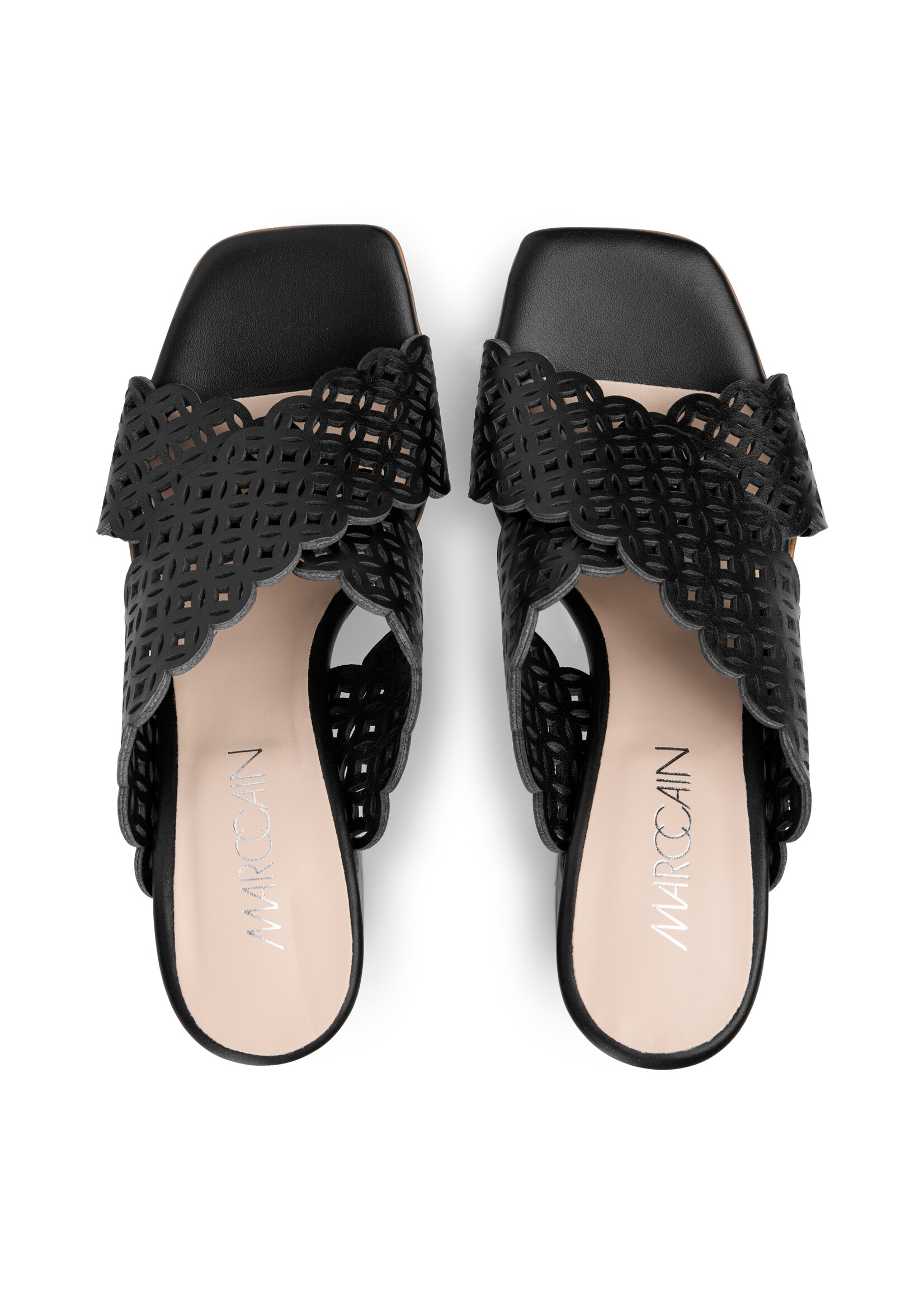 Muiltjes in jaren zeventig stijl. Met de typische dikke hak en het vierkante teengedeelte. Met gekruiste banden met gatenpatroon. De gewatteerde binnenzool zorgt voor comfort. Chique met wijde plooibroeken en lange jurken. Van ‘Rethink Together’.